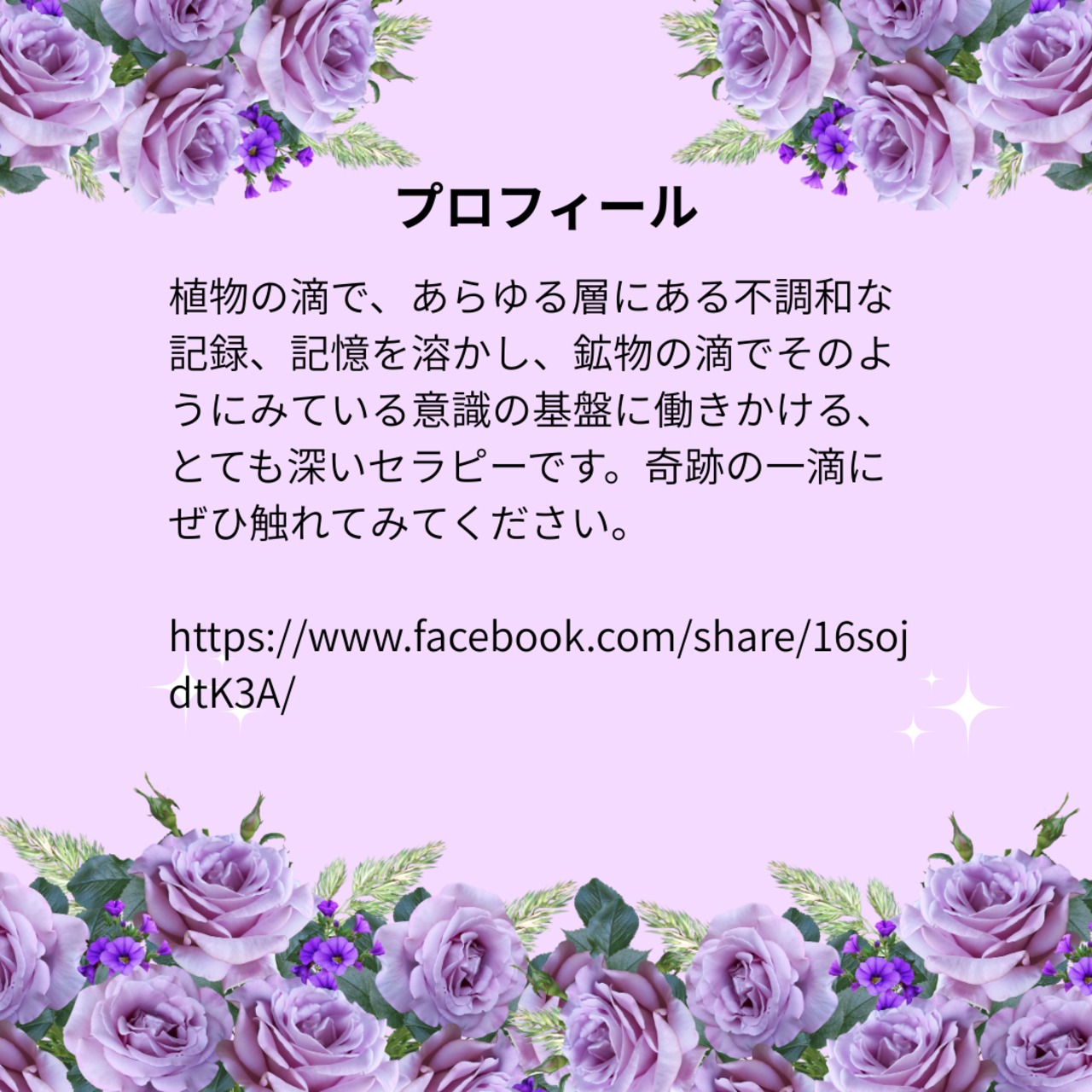 - **植物の滴&鉱物の滴 45分セッション**(5,000円)を通じて、天然のエネルギーを使用し、心と体を調和のとれた状態へと導きます。